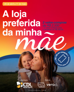 A Câmara de Dirigentes Lojistas de Santa Maria (CDL) lançou oficialmente sua campanha para o Dia das Mães, uma das datas mais importantes para o comércio ao longo do ano. De 20 de abril a 11 de maio a iniciativa tem como objetivo fortalecer as vendas, valorizar o comércio local e incentivar os consumidores a presentearem com carinho e propósito. Na campanha deste ano, nas compras acima de R$100,00 os consumidores ganham um cupom para concorrer a dois prêmios de R$ 2.500,00, ou seja, são chances em dobro para tornar o Dia das Mães ainda mais especial.